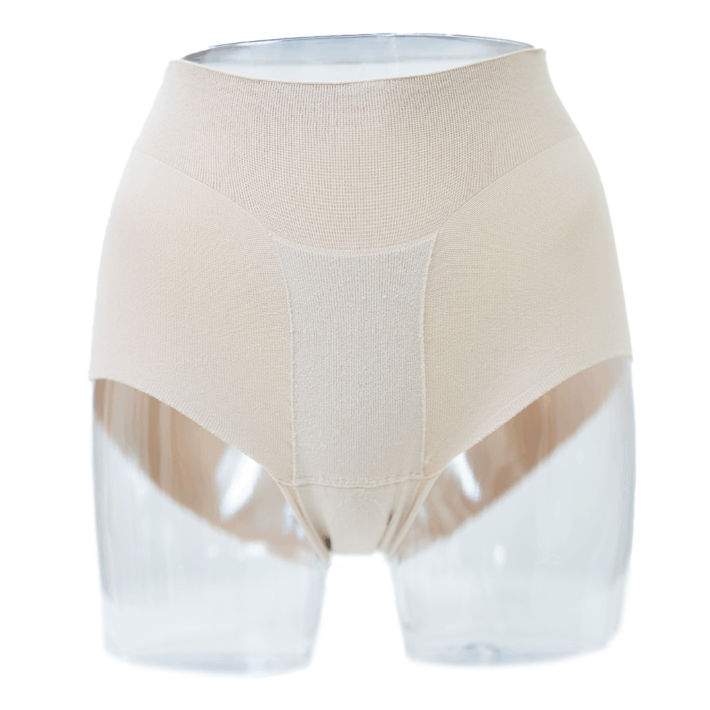 サポーターは、縦と横のベルトを調整することにより、クッション部分を膣口に密着させ、全体を定位置で固定します。使い勝手を考え、下着のように設計されていますが、基本的には横のベルトが腰にかかればお使いいただけます。