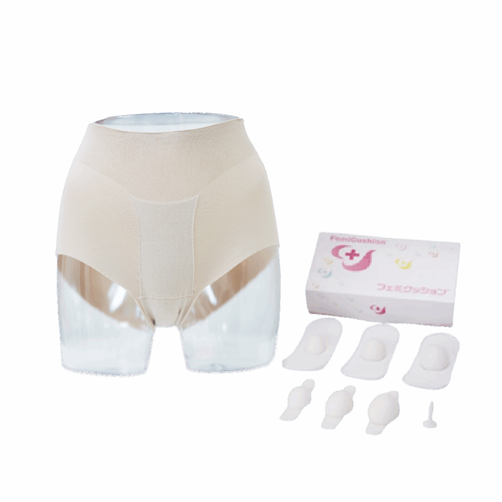 フェミクッションは、子宮脱・膀胱瘤・直腸瘤・小腸瘤・尿道脱など、全ての骨盤臓器脱(性器脱)の治療と予防を目的とした新しい医療機器です。違和感のない特殊なクッションで臓器を体内に戻します。体内に挿入・留置するものではないので、臓器・膣粘膜に負担がかかりません。